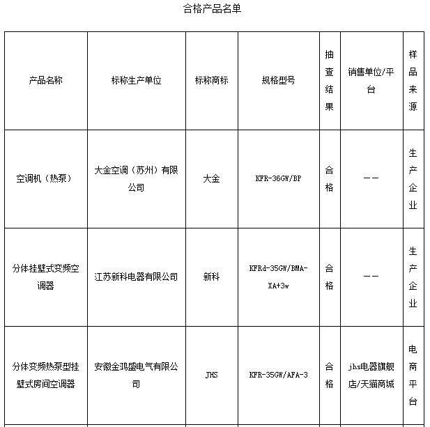中國質量新聞網訊 23日,江蘇省質監局公布家用空調器產品質量抽查結果。本次共抽查產品39批次,合格36批次,總體狀況較好。其中,變頻空調器全部合格,3批次不合格產品來自電商平臺,抽查江蘇企業生產的4批次空調器均合格。抽查顯示,部分產品在制冷量、制冷消耗功率、熱泵制熱消耗功率和能效值等項目上存在問題。